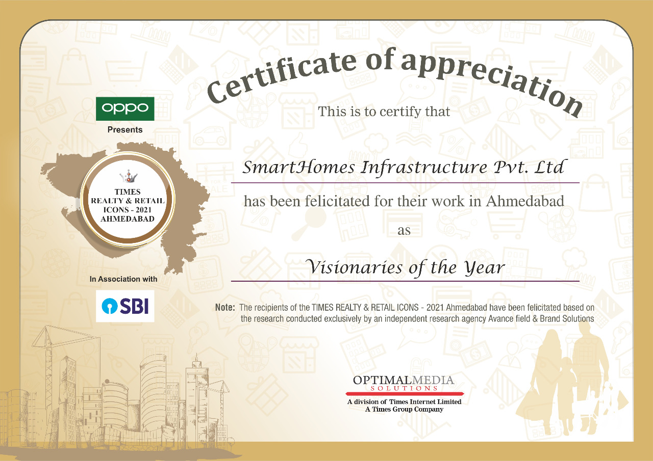SmartHomes Infrastructure Pvt. Ltd. is honoured to receive the "Visionaries of the Year" award at the Times Realty & Retail Icons 2021 in Ahmedabad. This accolade celebrates our dedication to innovation and excellence in real estate.