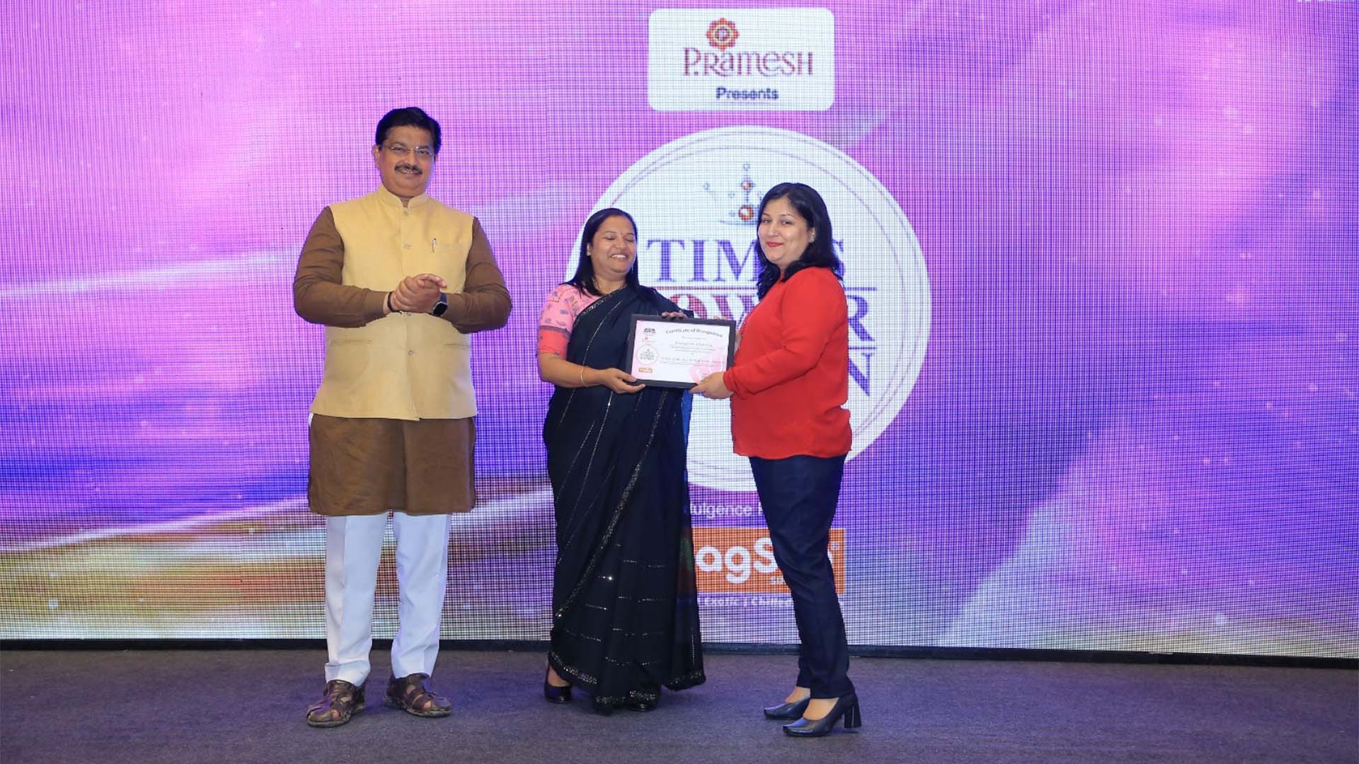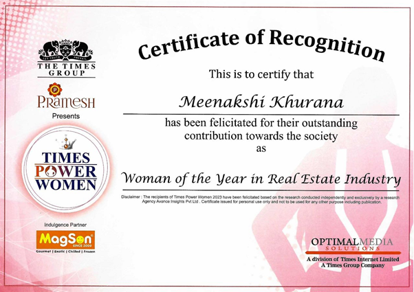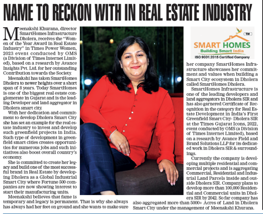 Meenakshi Khurana, Director of Smart Homes Infrastructure Dholera, receives "Woman of the Year in Real Estate Industry" at the Times Power Women 2023 awards. This honor, presented by The Times Group, P. Ramesh, and MagSon, recognizes her exceptional contributions and leadership in real estate. Her visionary approach and dedication have set new industry benchmarks.